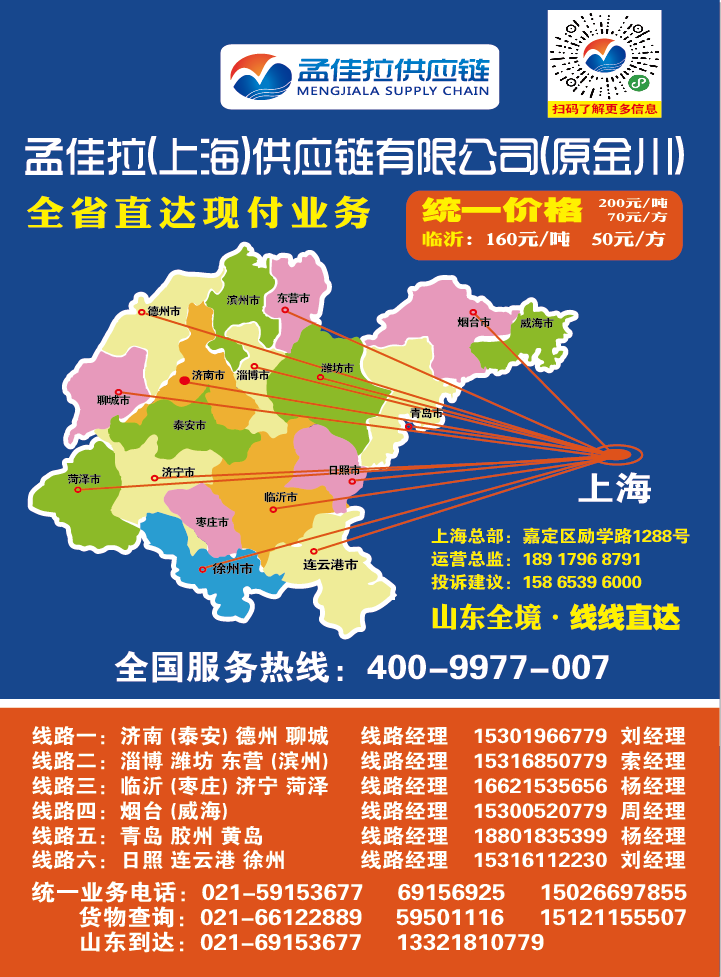 上海--济南 淄博 潍坊 青岛 烟台(龙口 海阳 莱州 栖霞)威海 (文登 荣成 乳山 石岛)临沂 (三区 九县)枣庄 (滕州 微山 薛城 台儿庄)日照 济宁 菏泽 甩挂运输